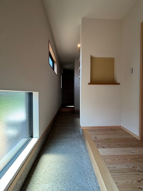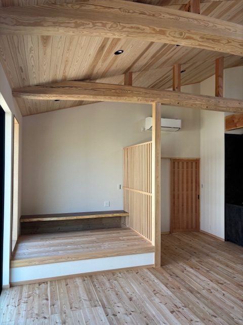 LDKの一角に設けた小上がりは、ヒノキの格子でやんわり仕切ったチルスペースとなります。天井近くに設けた窓により北側も採光が取れます。設備品など以外は既製品は無くほぼ手作業で出来上がった家です。