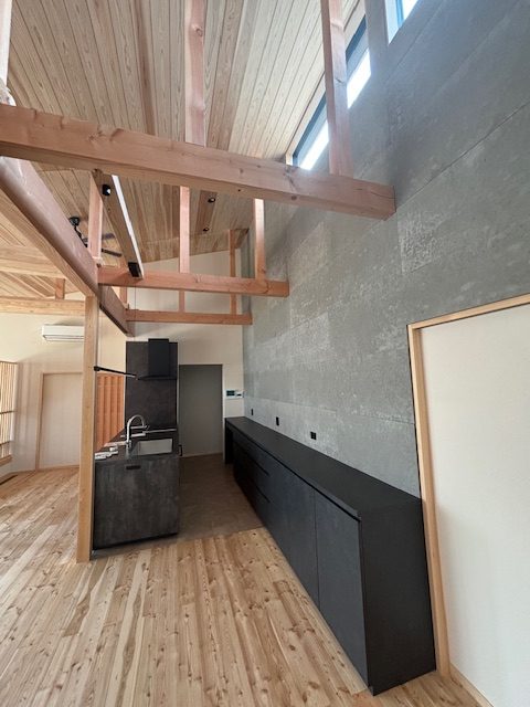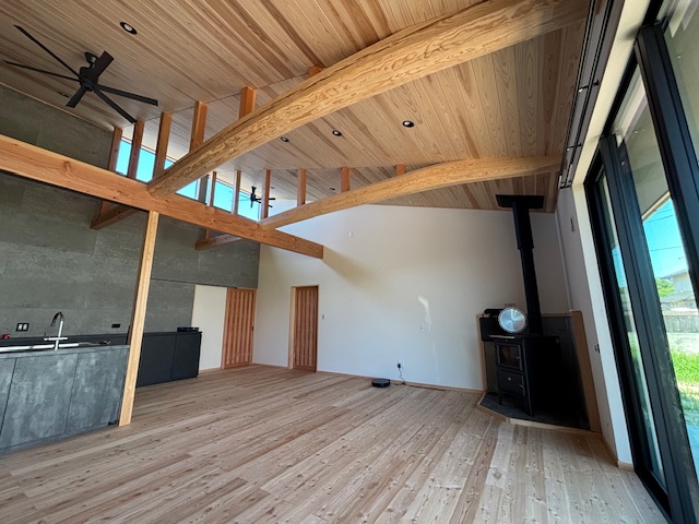 化粧木材の仕上げが中心でありつつ黒やグレーの硬質でソリッドな素材を使ったLDK。平屋ならではの勾配天井には3本の太鼓梁。薪ストーブの似合う無垢材の大空間が広がります。