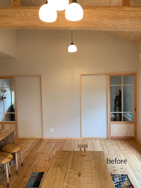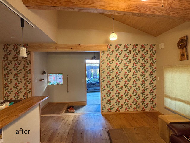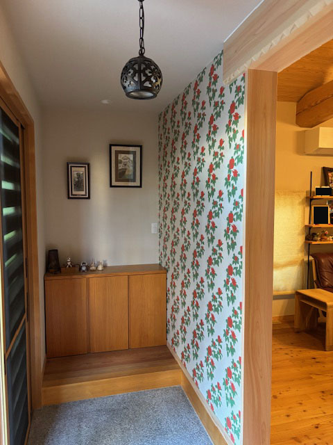 桧の梁は丸鉋で加工を施し見た目にもアクセント。2個所から入れるようにしておりましたが、今回を期に建具無しで間口の広い開口に。椿柄のクロスがインパクト大。